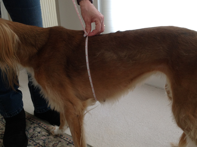 First, measure the back. I show measuring the whole length of the back, but for sizing purposes, measure from the base of neck to hip point.
